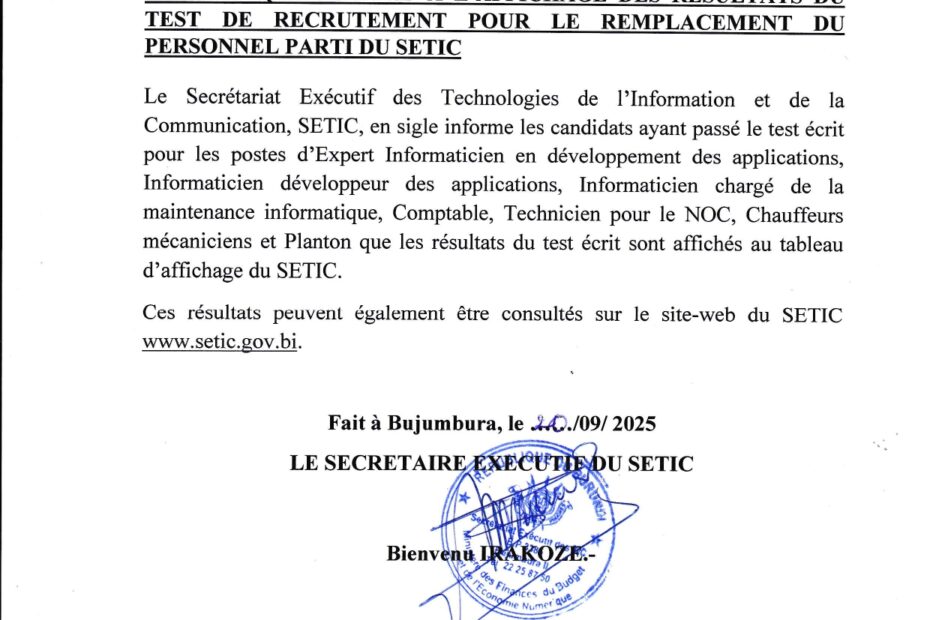 COMMUNIQUE RELATIF A L’AFFICHAGE DES RESULTATS DU TEST DE RECRUTEMENT POUR LE REMPLACEMENT DU PERSONNEL PARTI DU SETICpar seticgov RESULTATS DU TEST ECRIT SETICTélécharger Laisser un commentaire Annuler la réponseVotre adresse e-mail ne sera pas publiée. Les champs obligatoires sont indiqués avec *Nom * E-mail * Site web Commentaire * Enregistrer mon nom, mon e-mail et mon site dans le navigateur pour mon prochain commentaire.